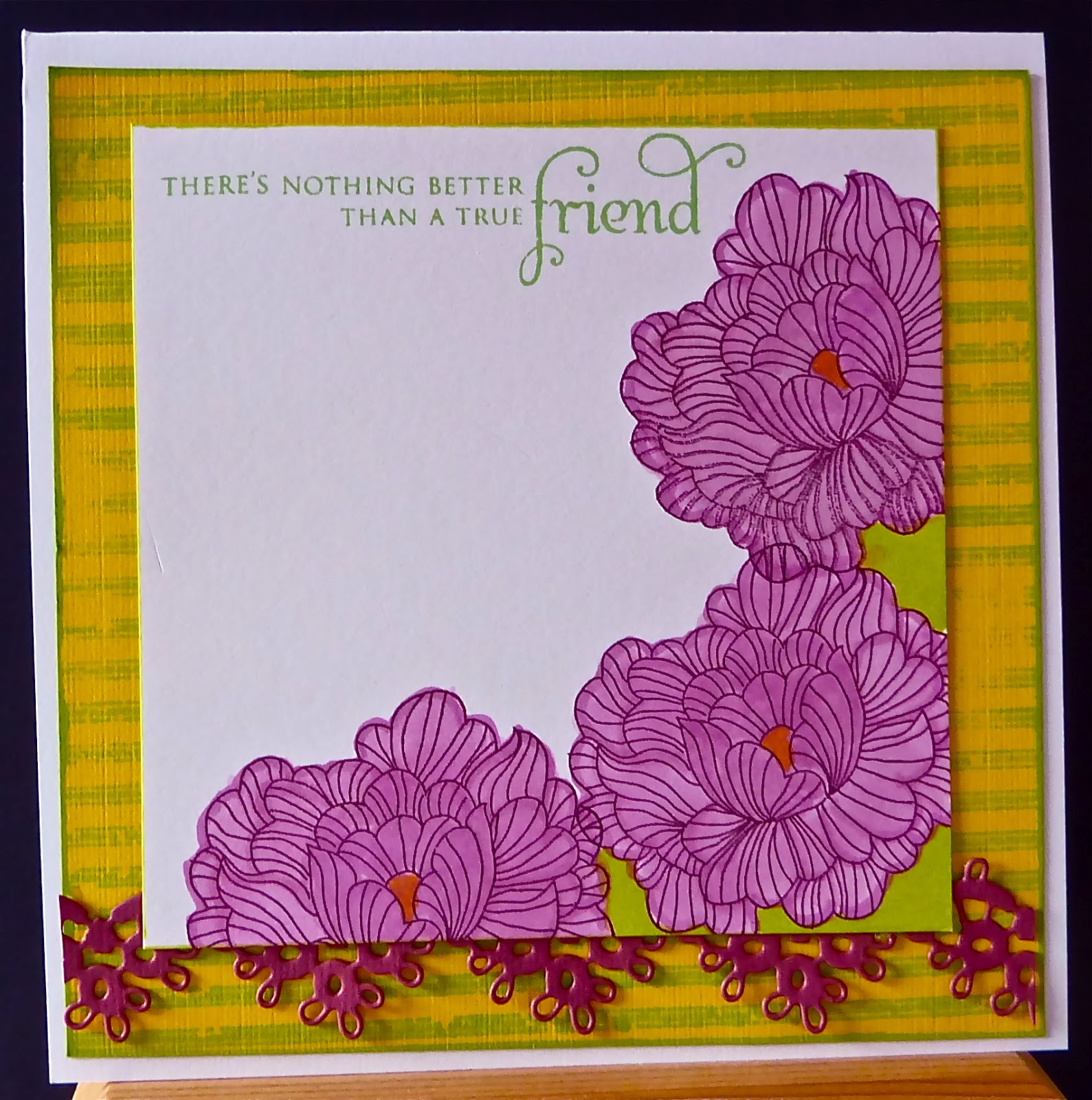 Split complimentary colors are fun to play with. You start with one color, find its compliment and instead of using the compliment, use the two colors beside the compliment. Mynnette has chosen the split complimentary color scheme of fuscia, green, and yellow for you to create with this week. White and cream are your acceptable neutrals again! You may stamp lined images and sentiments in either black or brown, but solid images should be stamped in fuscia, green, and/or yellow.